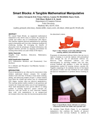 We created Smart Blocks, an augmented mathematical manipulative that allows users to explore the concepts of volume and surface area of 3-dimensional (3D) objects. This interface supports physical manipulation for exploring spatial relationships and it provides continuous feedback for reinforcing learning. By leveraging the benefits of physicality with the advantages of digital information, this ... read moretangible interface provides an engaging environment for learning about surface area and volume of 3D objects.read less