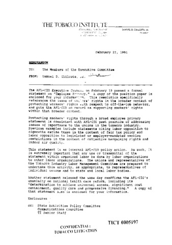 CONFIDENTIAL; Memorandum from Sam Chilcote to the executive committee regarding the AFL-CIO employee privacy statement. Places the issue of smokers’ rights in the broader context of workers’ rights. Emphasizes importance of labor relations and warns against contact of unions without going through other labor sources.