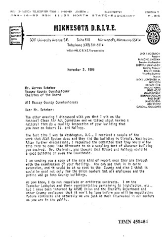 Letter to the Ramsey County, Minnesota Commissioner from the lobbyist of the local Teamsters union, Minnesota D.R.I.V.E. Requests permission to allow ACVA Systems to perform a clean air building analysis of a building of their choice. Argues that a building analysis is in the interest of both the Minnesota D.R.I.V.E. members as well as the general public served by the Ramsey County Commission.