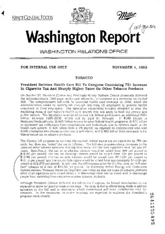 For Internal Use Only; Report by Kraft foods on Washington activities. Focuses on several topics including President Clinton's proposed tax increase on cigarettes to fund health care reform. Includes Henry Waxman's "Smoke Free Environment Act of 1993" and George Mitchell’s "Indoor Air Quality Report of 1993".