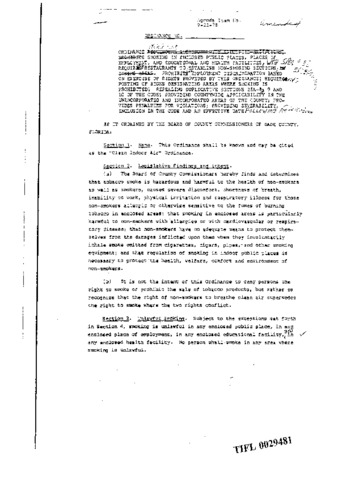 Marginalia; Draft; Draft of ordinance in Dade County regulating smoking in enclosed public places, places of employment, and educational and health facilities. Highlights exceptions laid out for smoker accommodation.