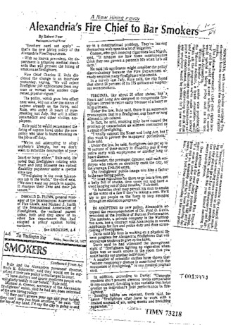 Copy; Illegible/Difficult to Read; Newspaper article reporting a ban on smoking for new recruits of Alexandria fire department. Discusses possibility of legal challenge to the ban by union officials. Explains role of Heart and Lung Act in decision to ban smoking. Includes recommendations of the Institute of Human Performance.