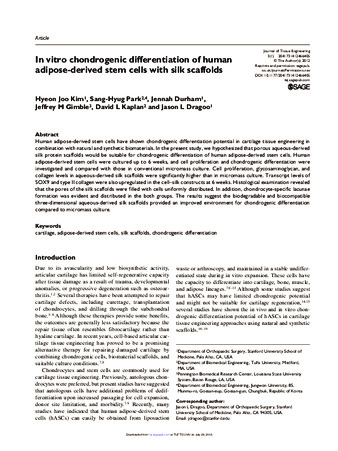 Human adipose-derived stem cells have shown chondrogenic differentiation potential in cartilage tissue engineering in combination with natural and synthetic biomaterials. In the present study, we hypothesized that porous aqueous-derived silk protein scaffolds would be suitable for chondrogenic differentiation of human adipose-derived stem cells. Human adipose-derived stem cells were cultured up to ... read more6 weeks, and cell proliferation and chondrogenic differentiation were investigated and compared with those in conventional micromass culture. Cell proliferation, glycosaminoglycan, and collagen levels in aqueous-derived silk scaffolds were significantly higher than in micromass culture. Transcript levels of SOX9 and type II collagen were also upregulated in the cell-silk constructs at 6 weeks. Histological examination revealed that the pores of the silk scaffolds were filled with cells uniformly distributed. In addition, chondrocyte-specific lacunae formation was evident and distributed in the both groups. The results suggest the biodegradable and biocompatible three-dimensional aqueous-derived silk scaffolds provided an improved environment for chondrogenic differentiation compared to micromass culture.read less