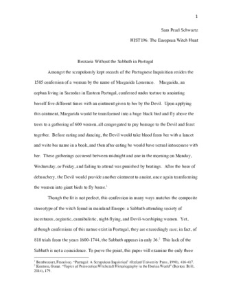 Tisch Library Undergraduate Research Award Winner, 2017. In contrast to what is found in the witchcraft trials of mainland Europe during the 15th-18th centuries, most witchcraft trials in Portugal lack evidence of the Sabbath (the incestuous, orgiastic, cannibalistic, nighttime meetings where witches professed their faith to the devil). This lack of the Sabbath is not a coincidence. To prove the ... read morepoint, this paper will examine the only three mainland European treatises cited by Portuguese inquisitors in witchcraft trials: Nicholas Eymeric’s Directorium inquisitorum, Heinrich Kramer’s Malleus maleficarum, and Martin Del Rio’s Disquisitionum magicarum libri sex. An investigation of these sources, as well as an analysis of secondary literature, will reveal the influence and role of the Portuguese Inquisition in this deliberate avoidance of the Sabbath.read less