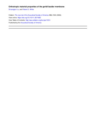 - Liu, Shuangqin, and Robert D. White. "Orthotropic Material Properties of the Gerbil Basilar Membrane." The Journal of the Acoustical Society of America 123, no. 4 (April 2008): 2160-2171. doi:10.1121/1.2871682.