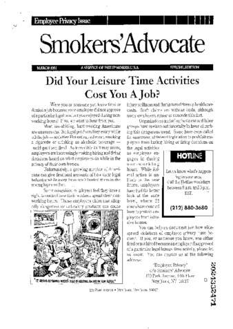 Smoker’s Advocate Newsletter reporting on employee privacy in the workplace. Argues that employers have no right regulating employees outside of the workplace. Deems decision to fire an employer based on the fact that he might smoke outside the workplace discrimination and thus infringing on civil rights.