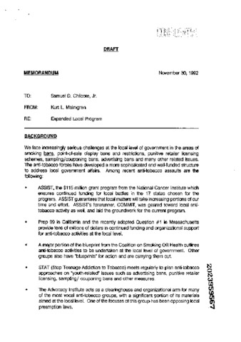 Marginalia; Illegible/Difficult to Read; Memorandum from Kurt L. Malgrem to Samuel D. Chilcote Jr. regarding expanding their local program. States that the anti tobacco groups are very adept at challenging the tobacco industry at a local level. Uses examples from California and Massachusetts to show that effective targeting of local issues can be effective. Outlines their strategy for dealing with ... read morelocal issues.read less