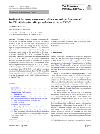 G. Aad, et. al. "Studies of the muon momentum calibration and performance of the ATLAS detector with pp collisions at $$\sqrt{s}=13$$ s=13 TeV." The European Physical Journal C, Springer Berlin Heidelberg, Berlin/Heidelberg, v.83, no.8, 2023