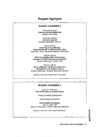 - Booklet detailing the events of the American Public Health Association's (APHA) annual meeting. Includes details of the opening general session as well as specific details of programs offered.
