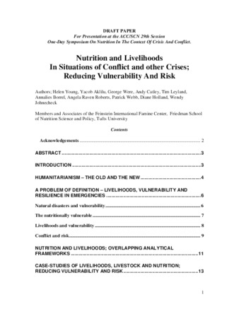 This paper describes three types of livelihood interventions aimed at supporting and protecting pastoralist systems of production. This generates a preliminary set of essential principles underlying a livelihoods approach in emergency contexts. These relate to: assessment and analyses; prioritising and combining response strategies; and combining appropriate technical skills, including public ... read morenutrition, together with local knowledge in implementing programmes. The paper concludes with an agenda for learning and applied research with particular emphasis on nutrition livelihoods linkages.read less