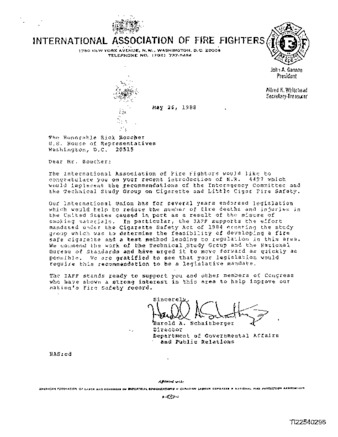 Marginalia; Letter from Harold A. Schaitberger to Representative Rich Boucher pledging support for the bill H.R. 4497, which would implement the recommendations of the federal panel studying cigarette caused fires. Attaches a press release announcing the bill.