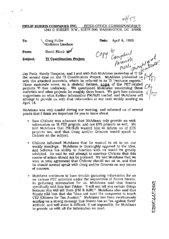 Marginalia; Memorandum from David Nicoli to Kathleen Linehan and Craig Fuller regarding the Tobacco Institute Coordination Project. Reports on a meeting with Bob McAdams, a member of the Tobacco Institute. Lists key points of the meeting, including the insinuation that members of the Tobacco Institute will not be forthcoming with information.