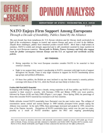 United States. Department of State. Office of Research. NATO Enjoys Firm Support Among Europeans. By Mary Demeri. Washington, D.C.: November 17, 2000. (Opinion Analysis M-197-00).