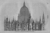 His original design for the cathedral (of which the elevation is subjoined) embodied the great principles expressed in his report on the old church. The length of aisle to which he objected was necessary perhaps for the processions and pageantry of the Romish ritual, but was uncalled for in the reformed cathedral service. He availed himself of this circumstance to give greater compactness and squareness to the church which was to be the basis and | |