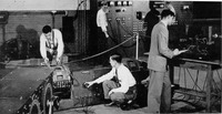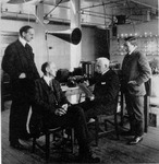 | Tufts from 1874 until 1910 as professor of physics. Dr. Dolbear is one of the men who invented the modern telephone. Authorities attribute to him the invention of the receiver as we now know it. His patents were later sold to the Bell Company. Dolbear also invented what we now call the condenser microphone. He sent wireless messages from Ballou Hall at Tufts College before anyone else in the world had sent such messages. In connection with Tufts' long history of relationship to the development of radio, physics and engineering it is interesting that the first regular broadcasts in America were sent out from the station and the high mast then located on the north slope of the Tufts campus. Tufts' interest in the scientific basis of radio and television development continues. Today the college is actively at work upon extensive research in this field for the Air Forces and the Signal Corps of the Army, as well as upon topics in this field related to pure physical science. | |