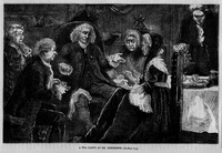 [extra_illustrations.1.113.3] , when Mrs. Hall (a sister of Wesley) was there, and Mr. Allen, a printer; Johnson produced his silver salvers, and it was It was on this occasion that the conversation fell on apparitions, and Johnson, always superstitious to the last degree, told the story of hearing his mother's voice call him day at Oxford (probably at a time when his brain was overworked). On this great occasion also, Johnson, talked at by Mrs. Hall and Mrs. Williams at the same moment, gaily quoted the line from the ,-- and Boswell playfully compared the great man to Captain Macheath. Imagine Mrs. Williams, old and peevish; Mrs. Hall, lean, lank, and preachy; Johnson, rolling in his chair like Polyphemus at a debate; Boswell, stooping forward on the perpetual listen; Mr. Levett, sour and silent; Frank, the black servant, proud of the silver salvers--and you have the group as in a picture. | ||||||||||||||||||||||