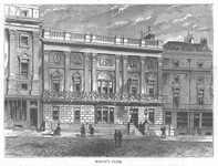 was the great Tory club, and in the days of the Regency, when Whig and Liberal peers could almost be counted on the fingers, it embraced -thirds, if not -fourths, of the among its members. Being so fashionable, it is not a matter of wonder that it should have been extremely difficult to gain entrance to it. Its doors were shut against anybody, however rich, who had made his money by mercantile industry. Its large bow window, looking down into , during the season, was very frequently filled by the leading dandies and beaux, who preferred lounging to politics: such as the Marquis of Worcester, the Duke of Argyll, Lord Alvanley, Lord Foley, Mr. G. Dawson Damer, Hervey Aston, Lloyd, &c. | |