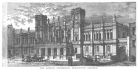 At the north end of this street, facing , a small and unimportant thoroughfare which connects the north end of Savile Row with that of , stands a large, heavy, and gloomy building, apparently almost without windows or doors. It is a school founded by Lady Burlington It covers part of what was originally called the A new scheme for the remodelling of this institution has lately (-) been propounded, and in all probability its endowment will be made available for the education of boys as well as girls. The name of serves to perpetuate yet another title of the house of Burlington. | |