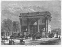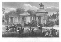 , which, as we have said, stands at the north-eastern corner of the Park, at the western end of , was erected about , at the expense of the inhabitants of and its neighbourhood, and took its name after the Duke of Cumberland, the hero of Culloden. It was at commonly called Tyburn Gate, from the gallows which stood close by. The original gateway was a mean brick building, comprising an arch with side entrances, and had wooden gates. Here took place, in , a disgraceful conflict between the people and the soldiery at the funeral of Queen Caroline, when persons were killed by shots from on duty. In the following year the unsightly brick arch and wooden gates were removed, and in their place some handsome iron gates were set up, at a cost of nearly ; but in these gates were removed in order to make room for the [extra_illustrations.4.405.7] (see page ) which now occupies the site, and the iron gates placed on each side of it. | |